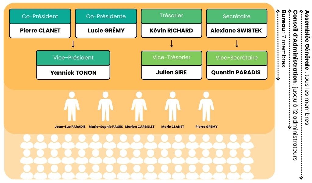 L'administration et la gestion de l'association sont désintéressées. L'association est dirigée par un Conseil d'Administration de 7 à 12 membres élus pour 1 an par l'Assemblée Générale dont les 7 membres du Bureau au minimum. Les membres sont rééligibles.